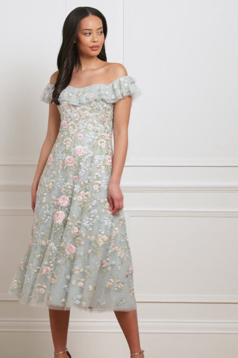 The Antoinettes Floral Off-Shoulder Ballerina Dress in French Blue. Inspired by the grandeur of Versailles, this ballerina dress features delicate, multicoloured floral embroidery trailing elegantly to the hem. The off-shoulder neckline is framed with playful circle-cut frills, while layers of soft net and tulle create a full, floaty skirt with a sweeping finish. A magical blend of romance, drama, and fairytale charm.