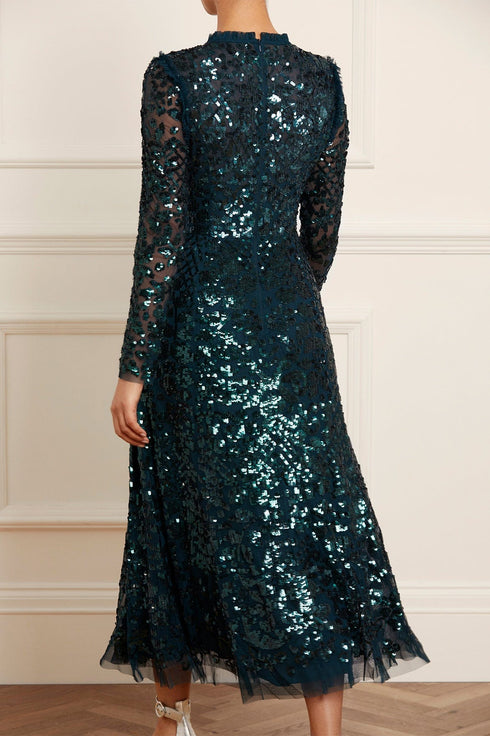 NEEDLE & THREAD EXCLUSIVE. The Aurelia Long Sleeve Ballerina Dress in Emerald Green. This ballerina dress is designed beautifully in a floral lace artwork inspired by a vintage lace tablecloth. This embellished dress is decorated with shimmering tonal sequins creating sparkle as you walk. Designed romantically with long sleeves, a playful silhouette and feminine detailing throughout. Expect all eyes on you in this statement piece.