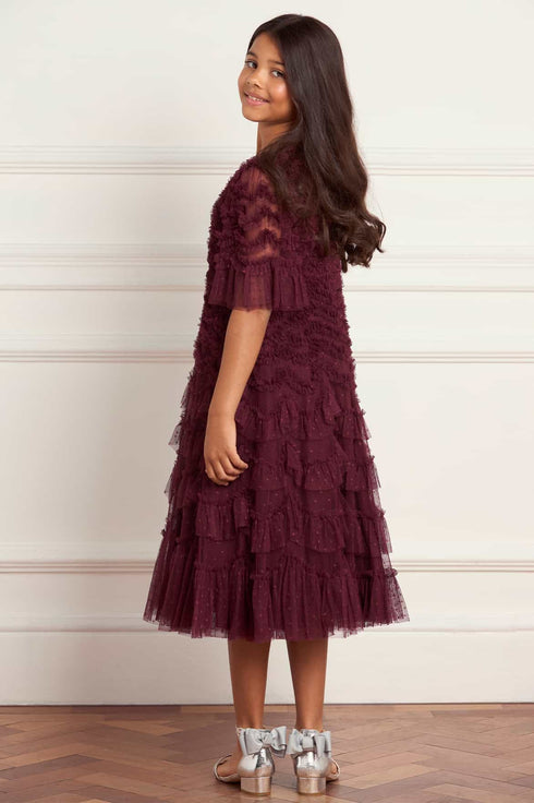 NEW SEASON. The Aviana Kids Dress in Claret. Romantic and rich, this dress encapsulates the Bright Star collection’s archival-inspired texture. Crafted in layers of soft tulle, scallop frills flow across the dress for playful structure and movement. The deep claret shade feels festive and elegant, making this a perfect party dress for the season. Designed to complement the Aviana Short Sleeve Gown in Claret from the womenswear range, ideal for twinning moments.