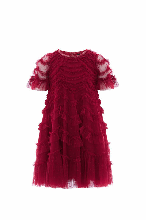 NEW SEASON. The Aviana Kids Dress in Red. A joyful burst of colour and texture. Designed with Needle & Thread’s signature scallop frills in delicate tulle, the dress balances playful volume with lightweight comfort. The bold red tone makes it a statement piece, ideal for festive occasions and family celebrations. Perfectly pairs with the Aviana Off-Shoulder Gown in Red from the adult collection for matching moments.