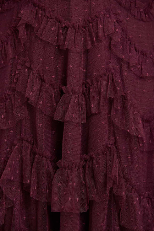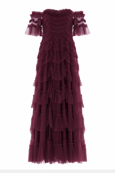 NEW SEASON. The Aviana Off-Shoulder Gown in Claret. A rich reinterpretation of a Needle & Thread signature. Designed with tiered scallop tulle and a romantic off-shoulder neckline, this style blends heritage-inspired textures with a deep wine-red hue.