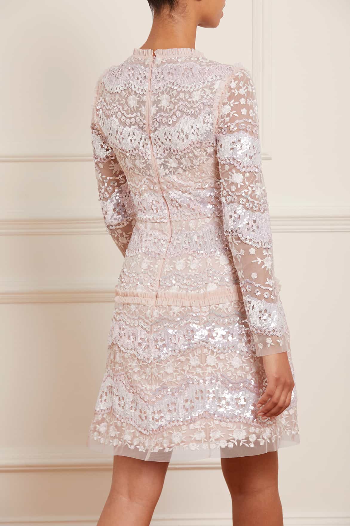 The Chantilly Sequin Micro Mini Dress in Petal Pink. A signature silhouette for Needle & Thread, featuring double layers of net to hold this elegant shape for the most flattering look. The artwork is inspired by 1930s styling, featuring floral embroidery in rich tonal shades and high impact sequin stripes. Make time to shine in the Chantilly