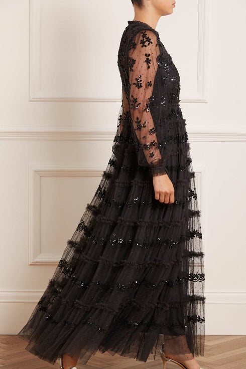 The Eve Sequin Gown in Graphite. This gown is romantically designed with a flattering, gently gathered bodice and full sleeves. Crafted with layers of our signature kisses tulle, and intricately adorned with shimmering sequin borders in pretty, lace-inspired designs. Make a statement in the Eve this season.