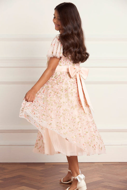 The Everett Bloom Kids Dress in Opal/Multi. This design is decorated with whimsical floral embroidery and crafted in soft layered tulle. The relaxed shape and soft colours make it ideal for unforgettable moments. Pairs beautifully with the women's Everett Bloom Gown from the AW25 collection.