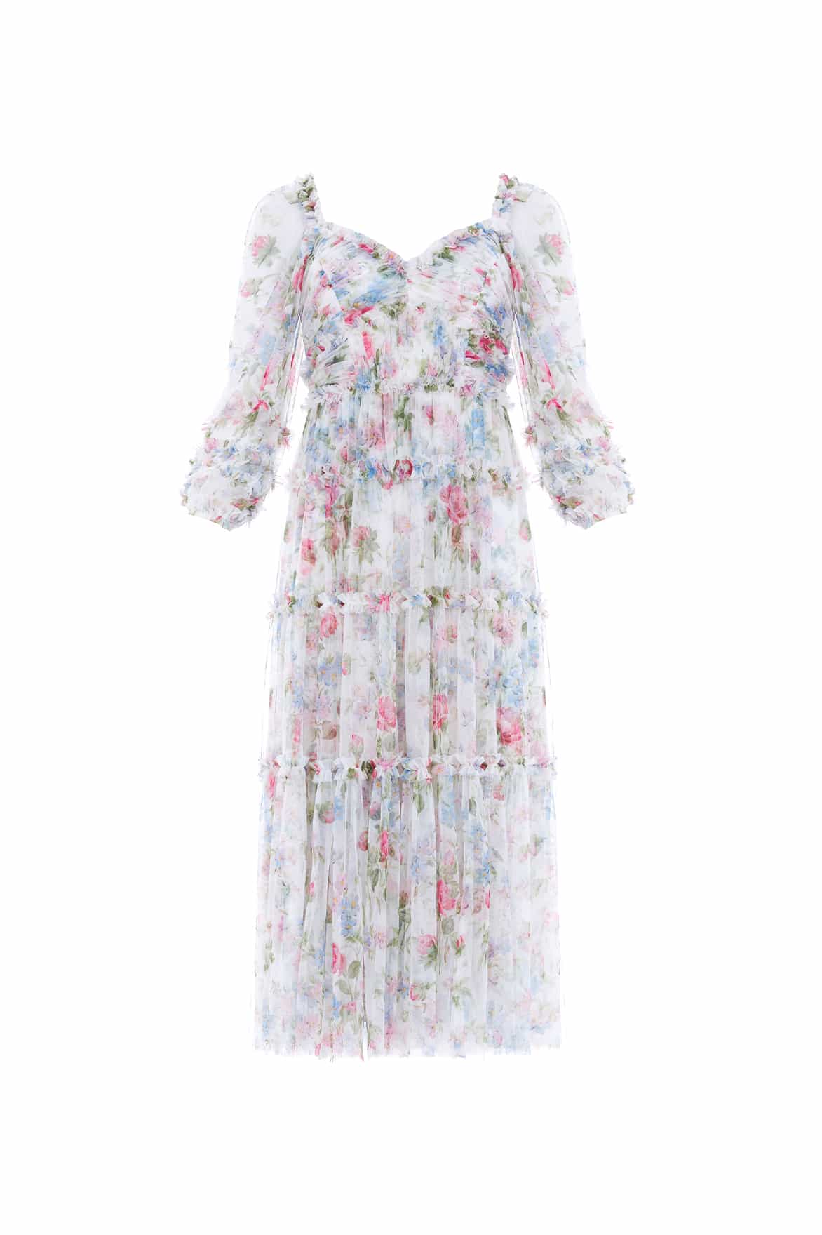 NEW SEASON. Floral Fantasy Ballerina Dress in Moonshine. Designed with a beautiful floral print taken from an early 1900’s hand-painted wallpaper design. Decorated with romantic garden florals that create an all-over, organic layout in a whimsical flower artwork. This dress features contemporary styling details with a cold-shoulder and signature frills that border the bodice and sleeves, adding a romantic edge. Developed with a loose fit silhouette for a effortless, whimsical look. The perfect dress for an upcoming special occasion.