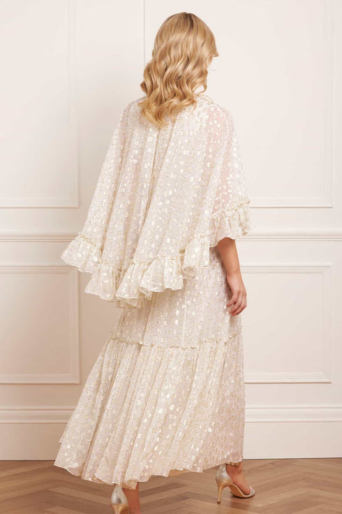 The Harper Lurex Cape Ankle Gown in Cream. Crafted in luxurious glittering gold lurex georgette fabric, this gown features a delicate, subtle leopard print motif that adds an understated touch of drama. The dramatic cape, with a detachable fastening, offers versatile styling options, while the soft chiffon creates a romantic, flowing silhouette. Perfect for transitioning seamlessly from day to night.