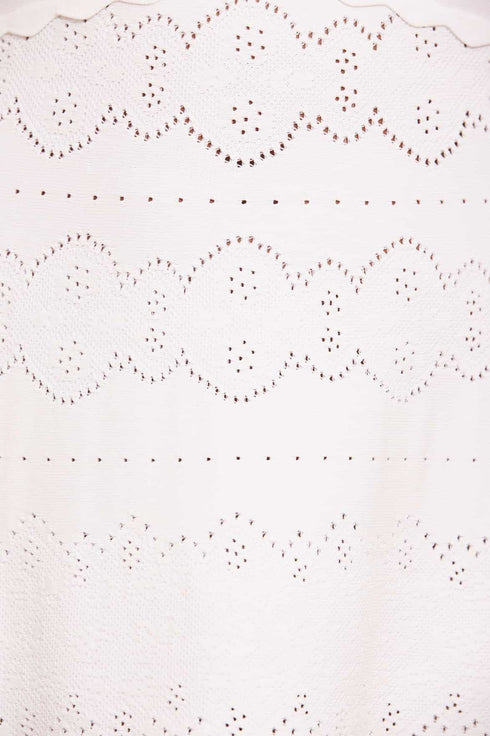 The Lace Knit Gown in Cream. This knitted gown is developed from recycled viscose blend, with stretch yarn for a beautiful, flattering texture. Decorated with stitch pointelle details inspired by vintage woven lace ribbons. Crafted with a fitted stretch bodice, a feminine V-neckline and scalloped trim details for a romantic look. This easy-to-wear piece is the perfect wardrobe staple.