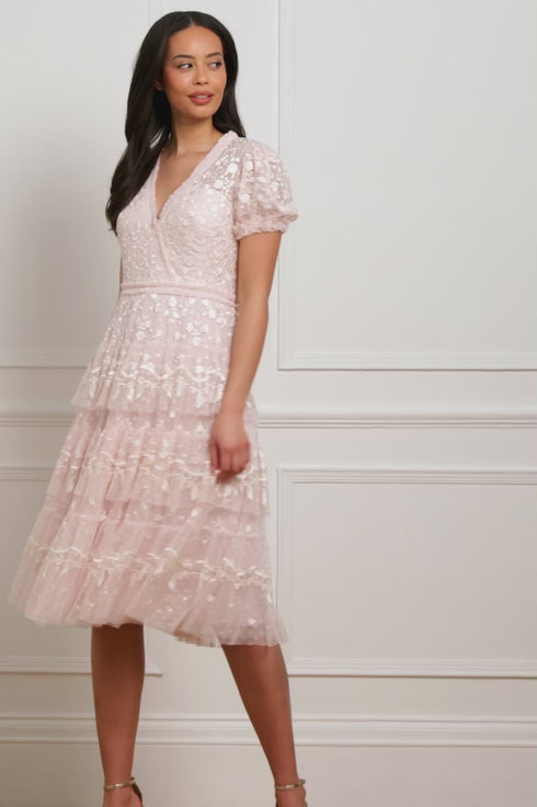 The Layered Lace Midaxi Dress in Dusk Pink/Cream. This Needle & Thread heritage style features exquisite vintage lace-inspired embroidery with floral motifs and trailing leaf and ribbon designs. The flattering wrap front bodice is accented with signature tulle ruffles, while the puff sleeves with elasticated cuffs add a delicate touch. A tiered skirt, crafted from layers of soft tulle, completes the design, offering a romantic and elegant silhouette.