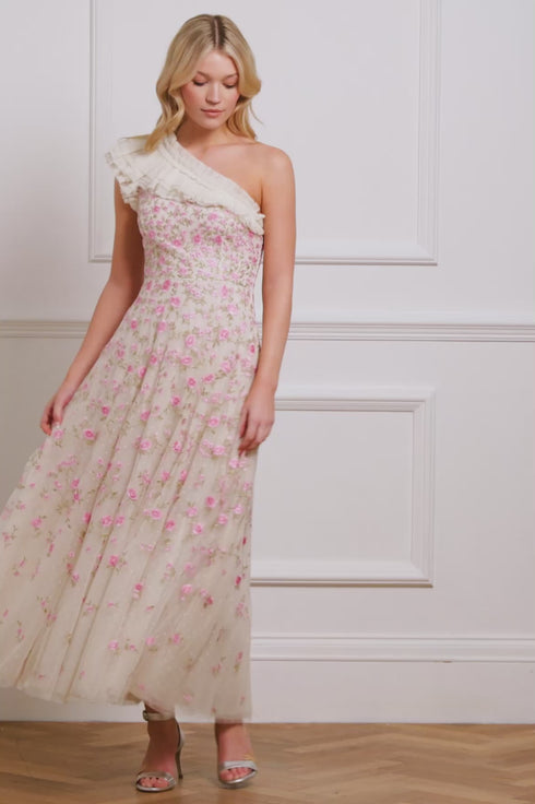 The Lea Ditsy One-Shoulder Ankle Gown in Cream/Pink features delicate floral embroidery inspired by a 1900s painting. The off-the-shoulder design adds elegance, while the skirt is made of layered tulle with statement frills for a romantic touch. The perfect gown for your next special event.