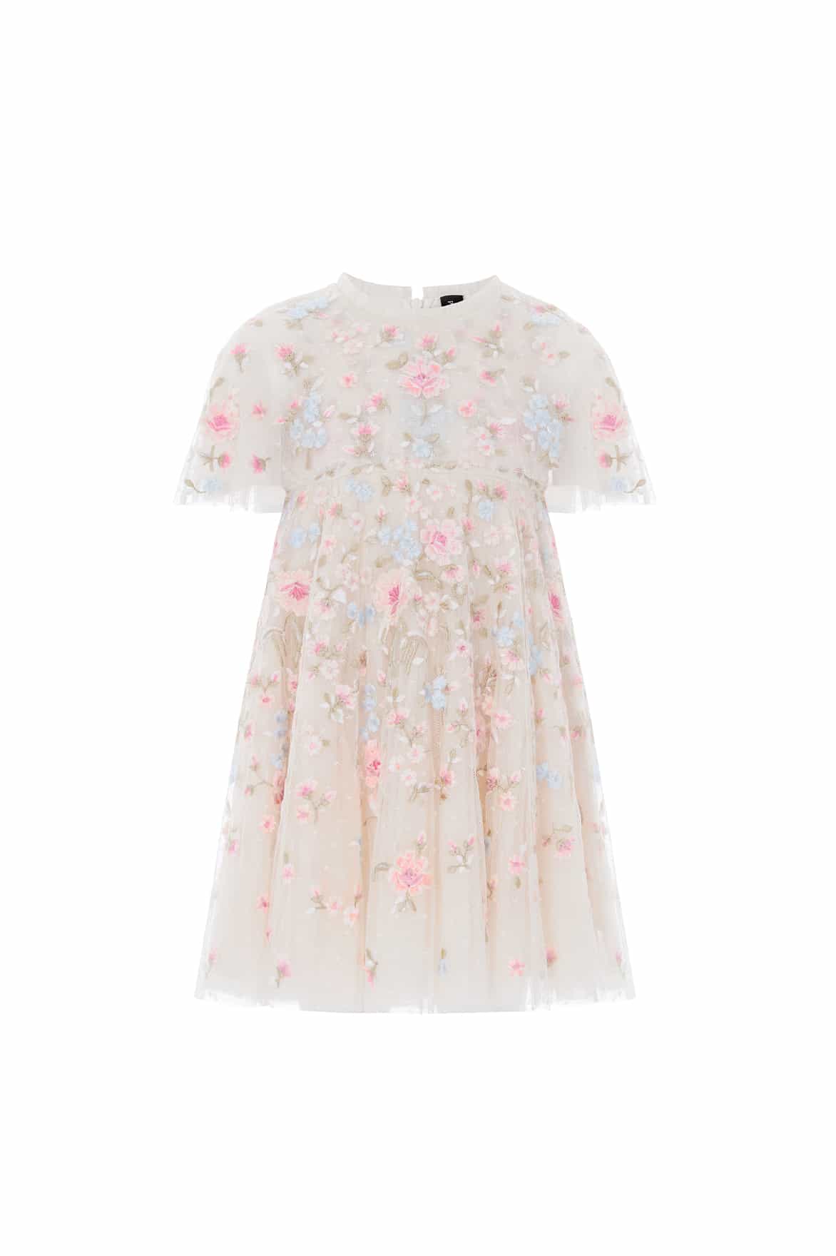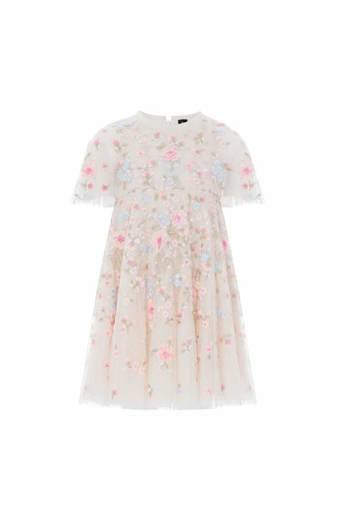 NEW SEASON. The Peony Bouquet Cape Kids Dress in Cream/Multi. This elegant kids dress features exquisite floral embroidery cascading gently across the design. Finished with a flowing cape detail and full skirt, it offers a timeless and refined silhouette. Perfect for a special occasion.