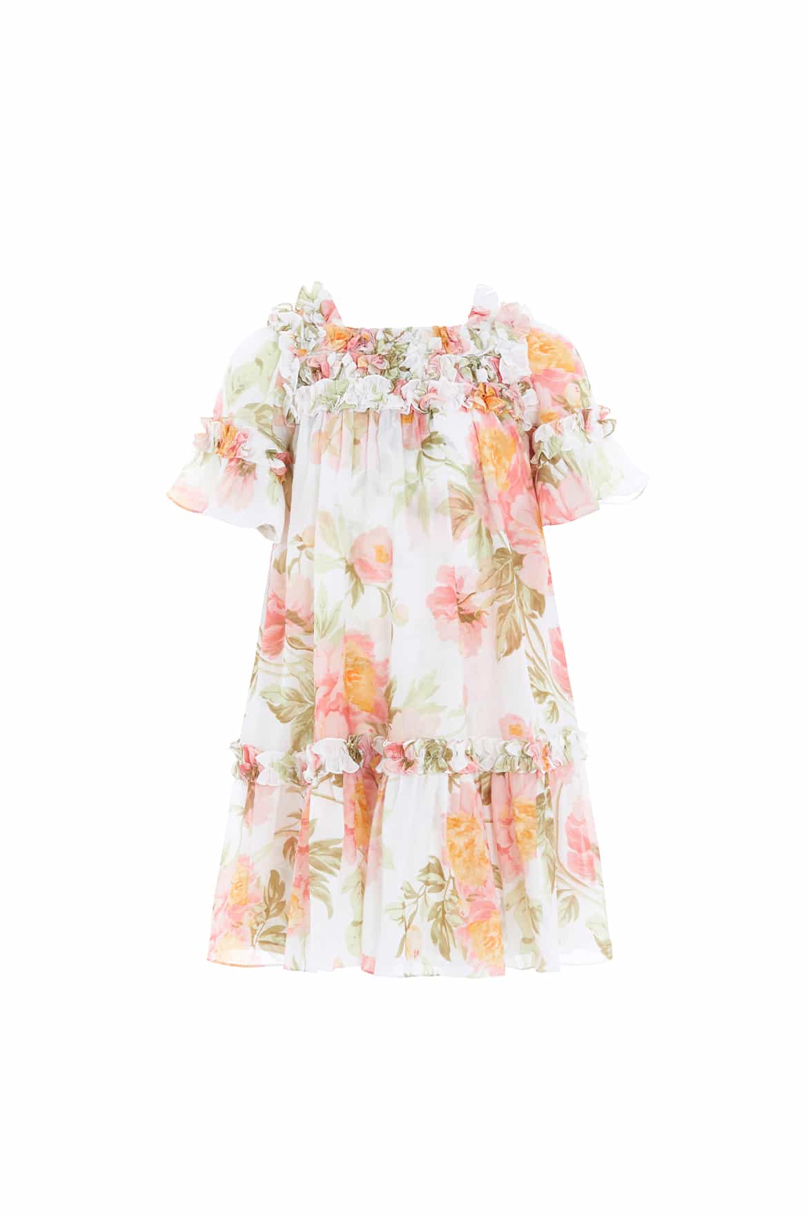 - Floral printed chiffon decorated with ruffles and elastic smocking