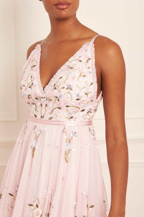 The Petunia Cami Gown in Peony Pink. Inspired by Edwardian vintage artwork, this elegant gown is designed with rich embroidered bouquets of delicate florals in soft, pastel shades and subtle, vibrant green highlights. Shimmering iridescent sequins scattered throughout add a glistening effect to the piece. Intricately cut with fine, delicate tulle ruffles trimming the neckline and a voluminous skirt that features a net under layer to hold the shape and create a romantic silhouette. The ultimate fairytale style.
