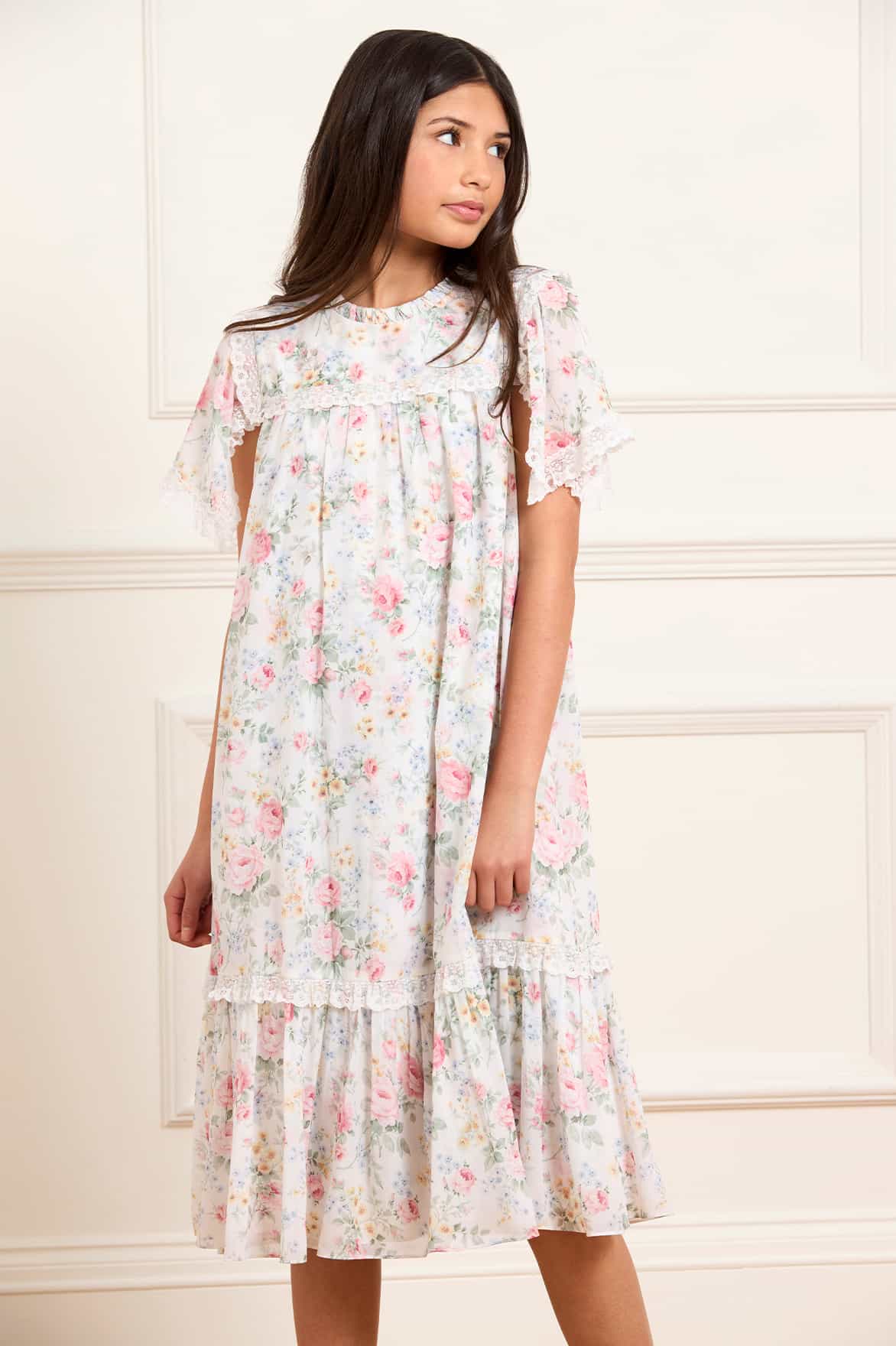 The Pompadour Garden Chiffon Lace Kids Dress in Moonshine. This dress features hand-painted floral bouquets and trailing ditsy motifs, inspired by the Palace of Versailles. Designed with delicate lace-edged handkerchief sleeves and a loose, comfortable fit adds vintage charm. Crafed with signature Needle & Thread frills at the neckline and a softly gathered, lace-edged skirt creates a perfect twirl-ready look.