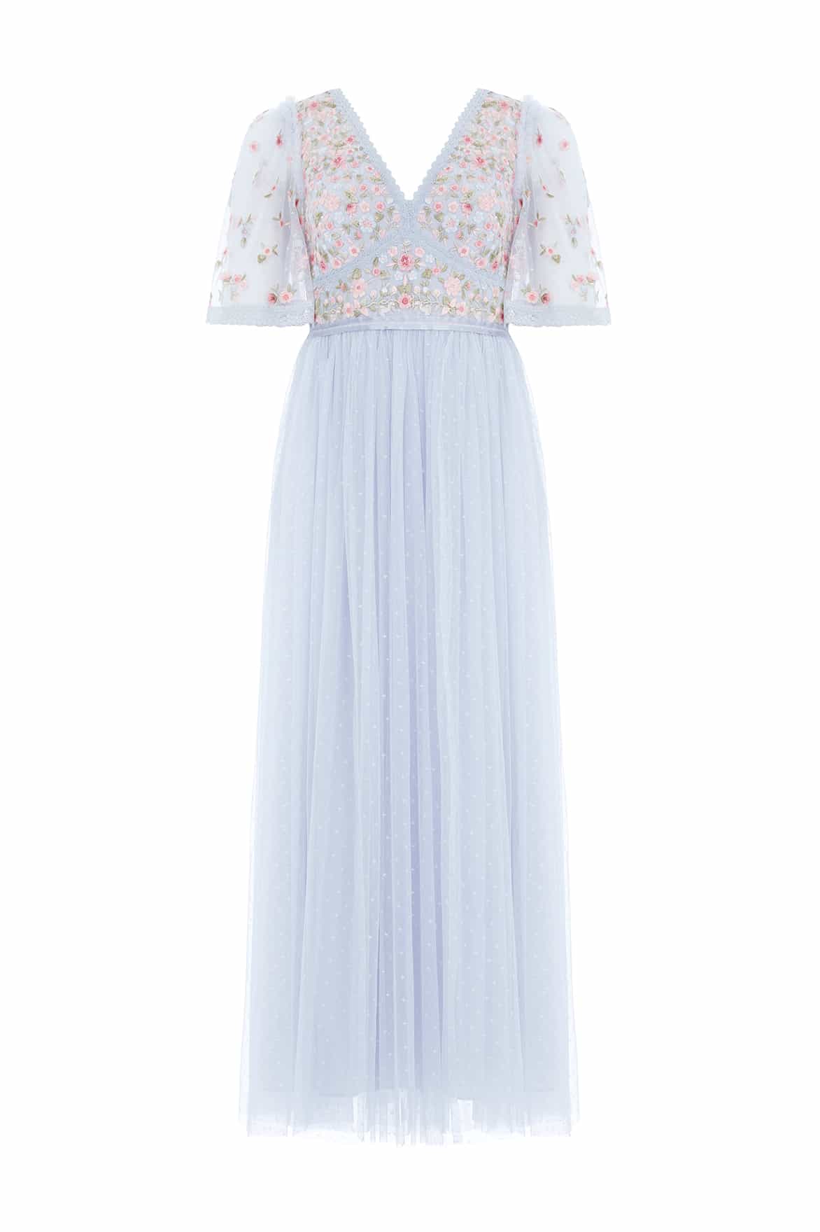 The Ribbon Bouquet Bodice Ankle Gown in Blue / Pink Multi. The bodice of this gown is intricately designed with embroidered bouquets of flowers in rich tones, inspired by a 1930s vintage print. Beautifully adorned with delicate lace trims for signature Needle & Thread detailing. The skirt features layers of tulle to create a romantic silhouette. The perfect gown for an upcoming occasion.