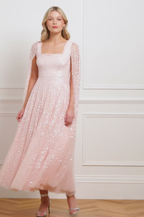 The Scatter Dot Cape Sleeve Ankle Gown in Dusk Pink. This embellished gown is decorated with exquisite shimmering dot motifs, undulating in wave formations for a captivating glittering effect. Designed with a sweeping floor-length cape for romantic detailing and a statement look. The flattering square neckline is trimmed with signature Needle & Thread tulle frills. The skirt is made up of generous layers of net and tulle with a sweeping hemline. The perfect choice for an upcoming special occasion and beyond.