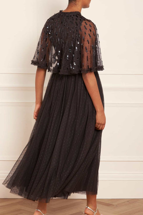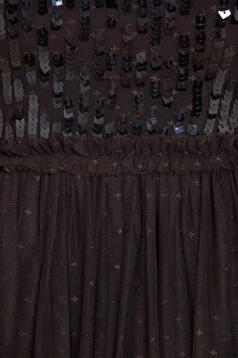 The Sequin Dash Bodice Ankle Gown in Graphite. The bodice of this ankle length gown is adorned with statement, square sequins in a staggered linear layout creating a shimmering effect. Developed with a loose silhouette for an effortless, floaty feel featuring voluminous sleeves for a romantic look. The skirt is crafted with layers of net tulle creating movement as you walk. The perfect gown for an upcoming special occasion.