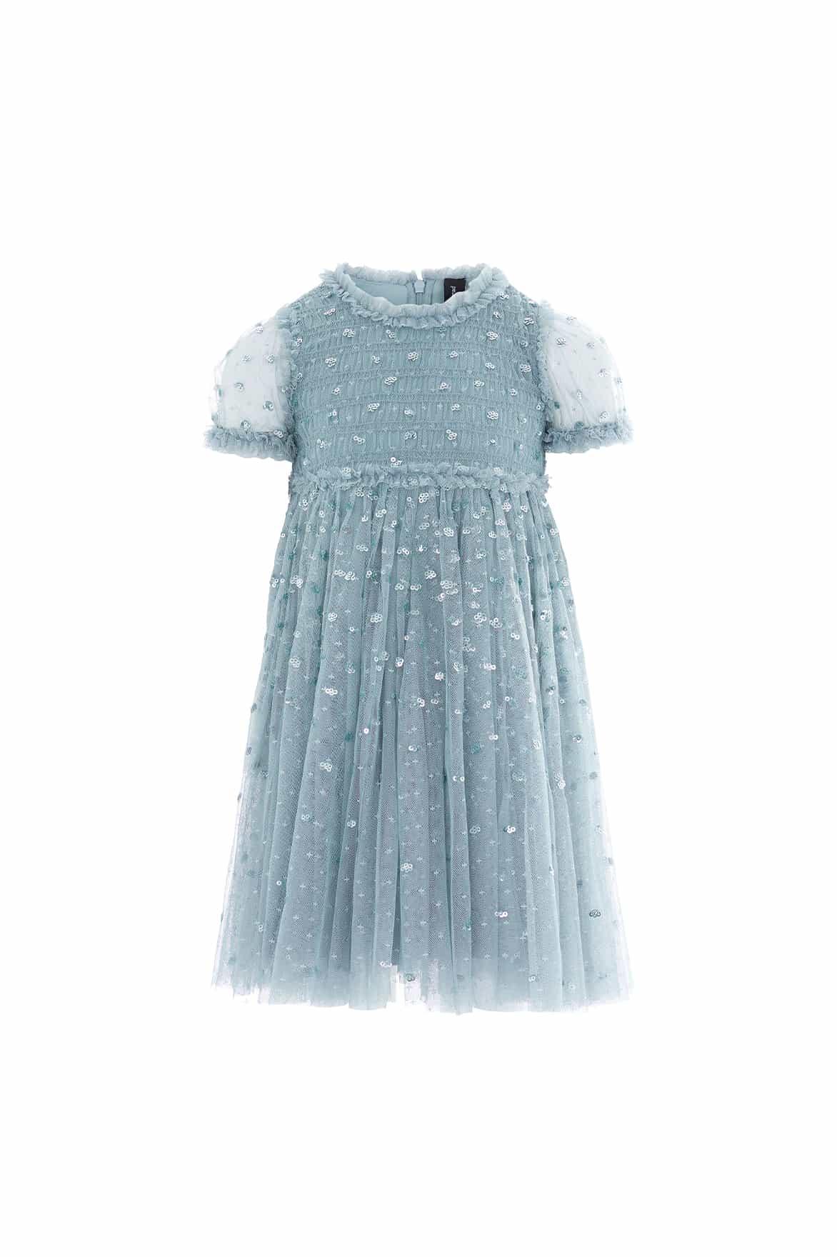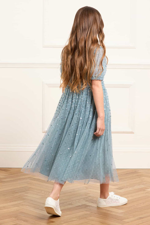 The Sequin Giselle Kids Dress in Thistle Blue. This enchanting dress features glittering sequin dot motifs that scatter toward the hem, with a high-shine foil finish for added lustre. The shirred bodice and short puff sleeves with tulle frill cuffs create a charming silhouette, while signature Needle & Thread ruffles at the neckline, shoulders, and waist add a pretty touch. The voluminous tulle skirt offers beautiful fullness—perfect for twirling.