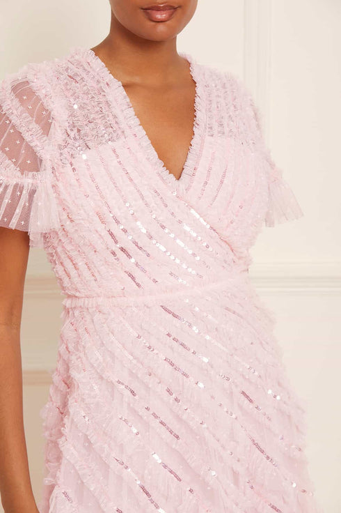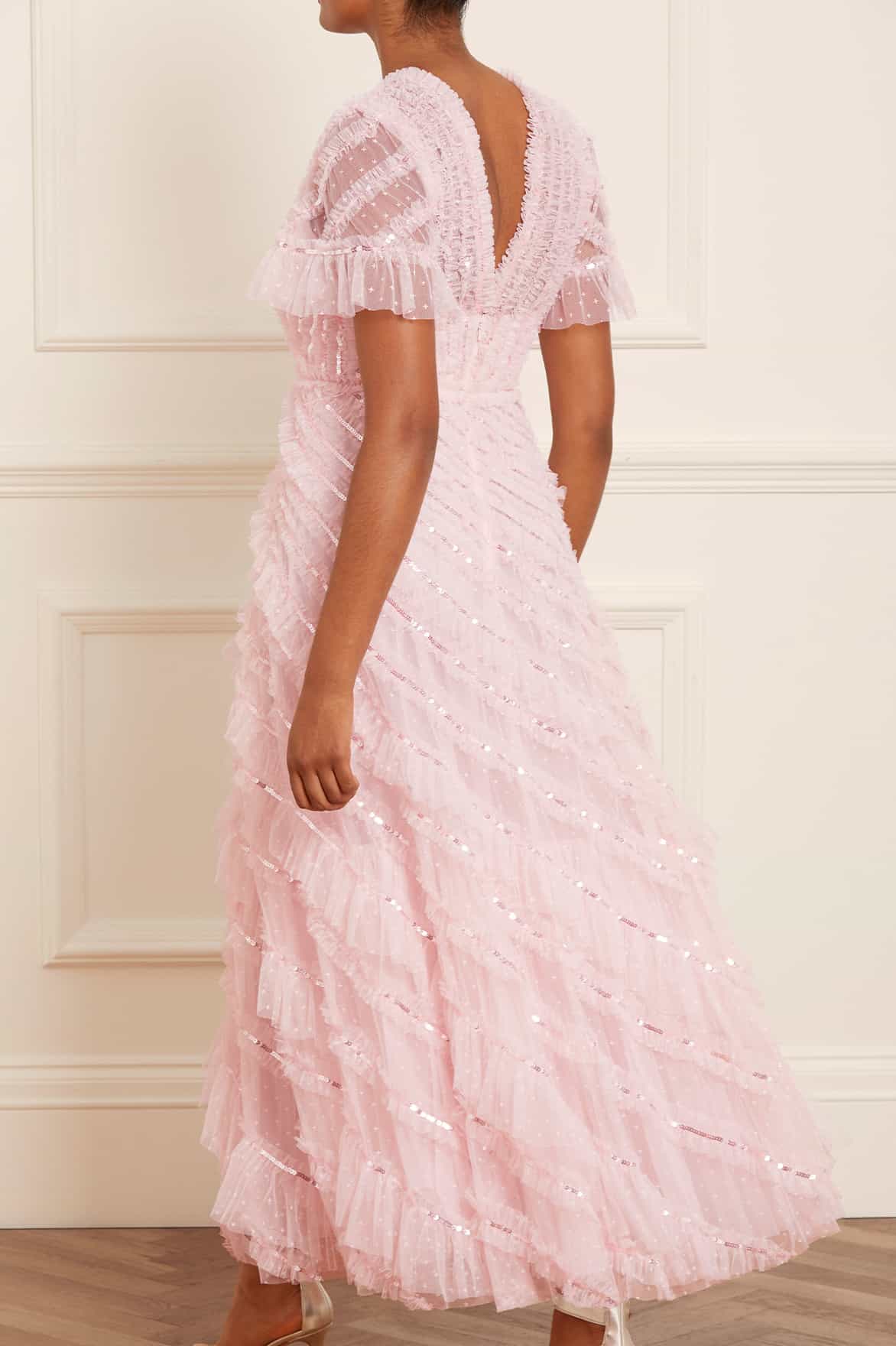 The Spiral Sequin V-Neck Ankle Gown in Peony Pink. A brand new style for the season ahead. This gown is a true statement piece, featuring all over frothy texture to create a signature Needle & Thread look. Beautifully engineered with gathered, spiral texture and intricate, shimmering sequins adorning each individual frill creating an enchanting effect. Make an appearance in this romantic style.