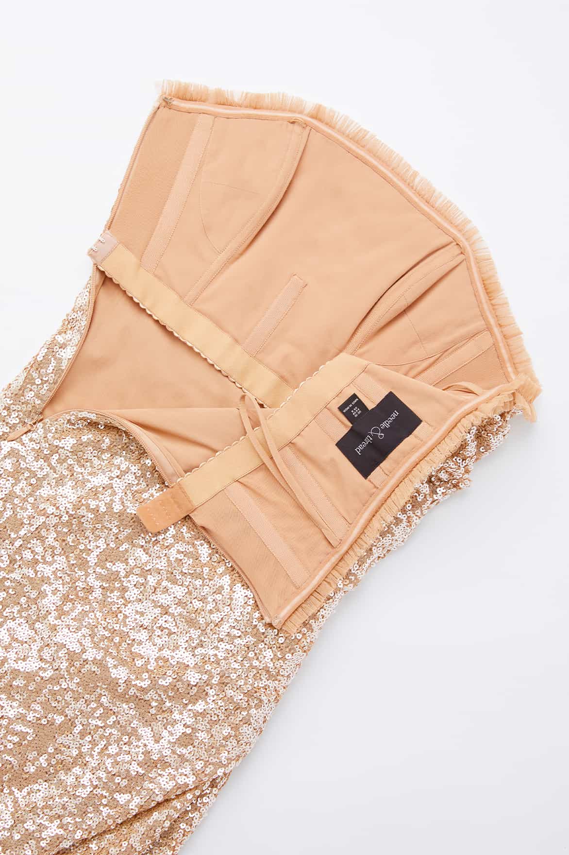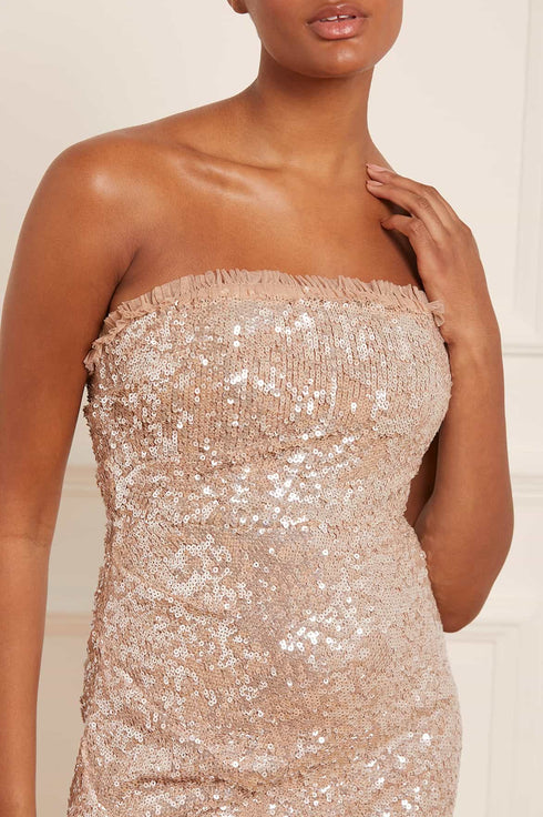 The Stellar Gloss Strapless Ankle Gown in Soft Camel / Gold. A brand new design for the season ahead. The Stellar is beautifully adorned with specially sourced gloss sequins for extra sparkle and shimmer. Designed with beautifully draped fabric to create the most flattering silhouette. Developed with an integrated corset made with ribbon stitching, soft boning and panels of stretch mesh fabric for comfort and security in the fit. Make a striking impact in the Stellar.