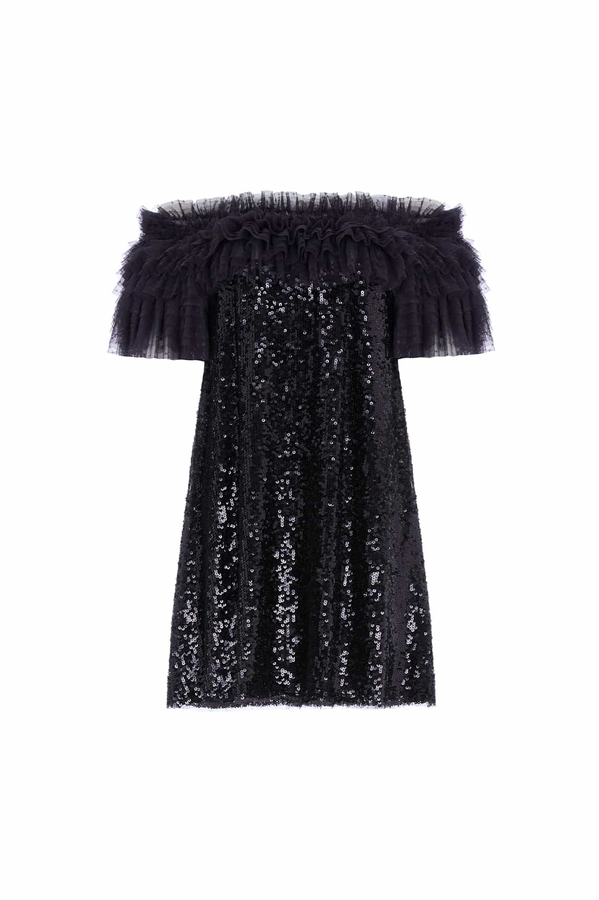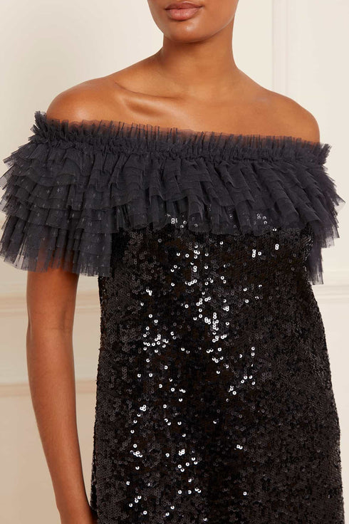 The Stephanie Micro Mini Dress in Graphite. A brand new party style for the season ahead. Beautifully crafted with a statement ruffle off-the-shoulder design, developed from layers of tulle and net to create this playful look. The neckline and sleeves are fully elasticated along the top edge for comfort. Decorated with shimmering, rich sequins to create an enchanting, glistening effect. Expect all eyes on you in this magical, fun style.