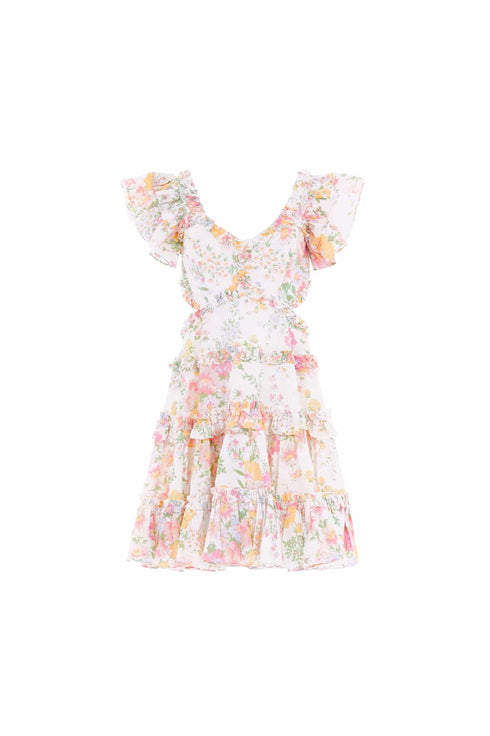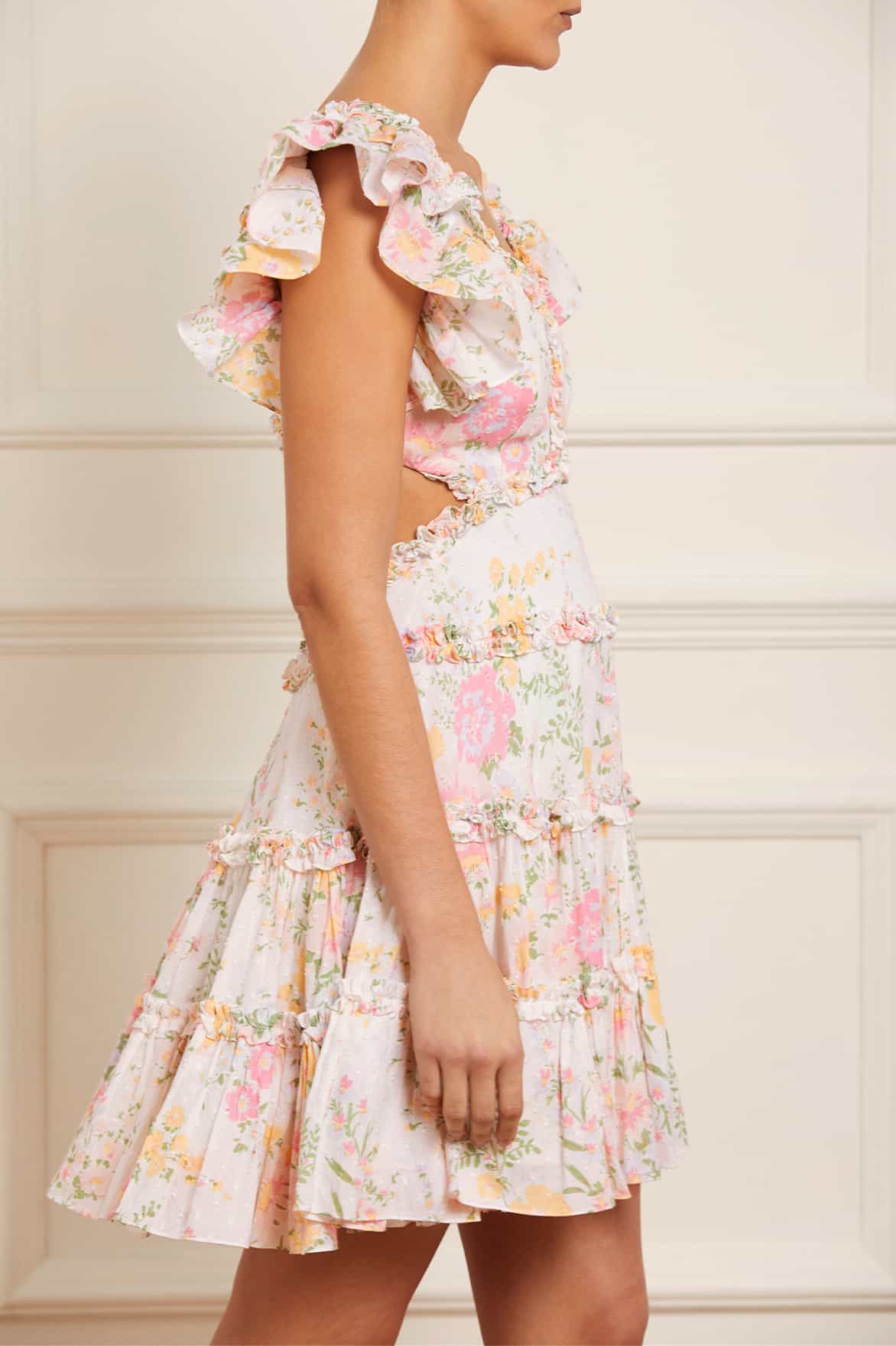 The Sunrise Bloom Backless Cotton Micro Mini Dress in Moonshine. This backless cotton mini dress is adorned with a summer floral print inspired by an early 1900's hand-painted design. Developed with florals in a soft, sunset shade for a playful palette. Crafted in our soft, organic cotton featuring signature Needle & Thread frills. Designed with an open back, created in the most flattering and secure way, with a button finish at the top neck. A transitional day to night piece.