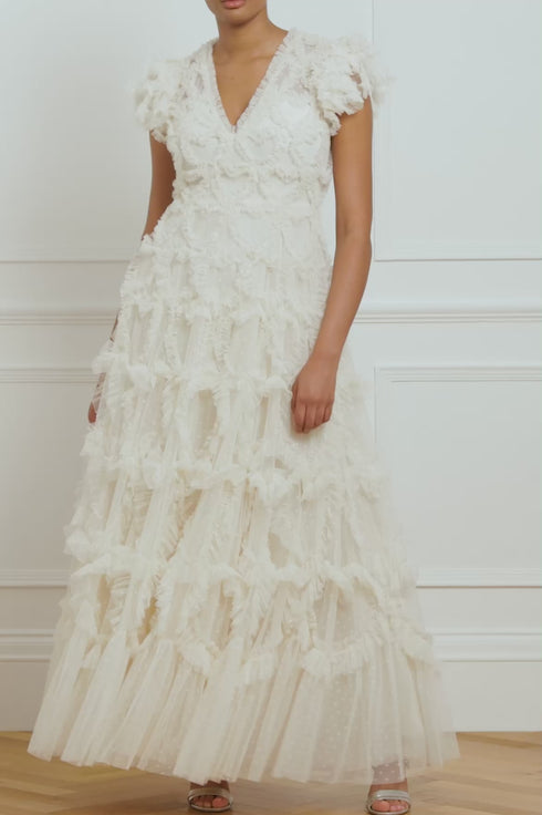 The Amorette V-Neck Gown in Cream. A signature Needle & Thread style; beautifully adorned with our key love heart motif, made from gently gathered delicate tulle. Designed with romantic, frothy sleeves created using layers of delicate tulle and frills for a statement look. Featuring a generously voluminous skirt layered with tulle and net for a full, magical silhouette. A textile piece you'll forever treasure.