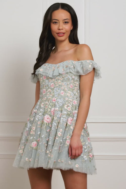 The Antoinettes Floral Off-Shoulder Micro Mini Dress in French Blue. Inspired by the grandeur of Versailles, this mini dress features delicate, multicoloured floral embroidery trailing elegantly to the hem. The off-shoulder neckline is framed with playful circle-cut frills, while layers of soft net and tulle create a full, floaty skirt with a sweeping finish. A magical blend of romance, drama, and fairytale charm.