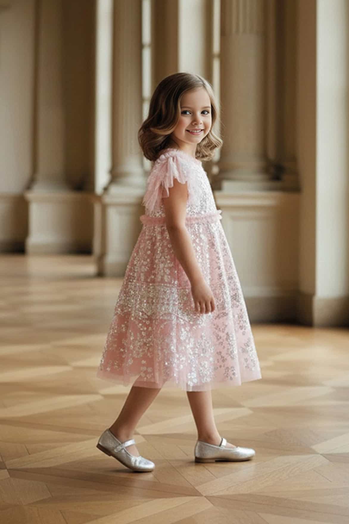 The Aurora KIDS Dress in Dusk Pink/Cream. A heritage style from the Needle & Thread archive, inspired by early 1900s antique tablecloths. Crafted with intricate sequin embroidery and signature tulle frills at the neckline, waist, and sleeves. Finished with a soft, layered tulle skirt for elegant movement. A dreamy fairytale dress that will make them feel like a true princess.