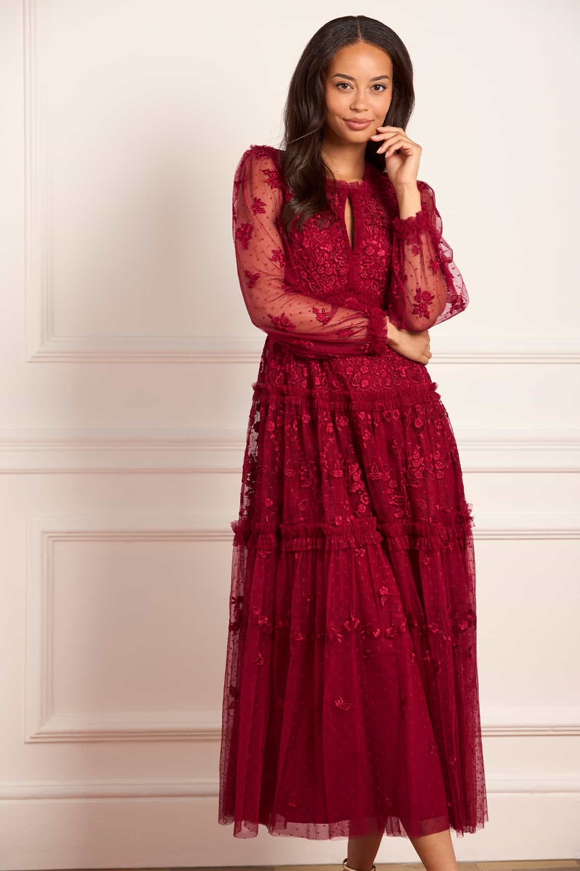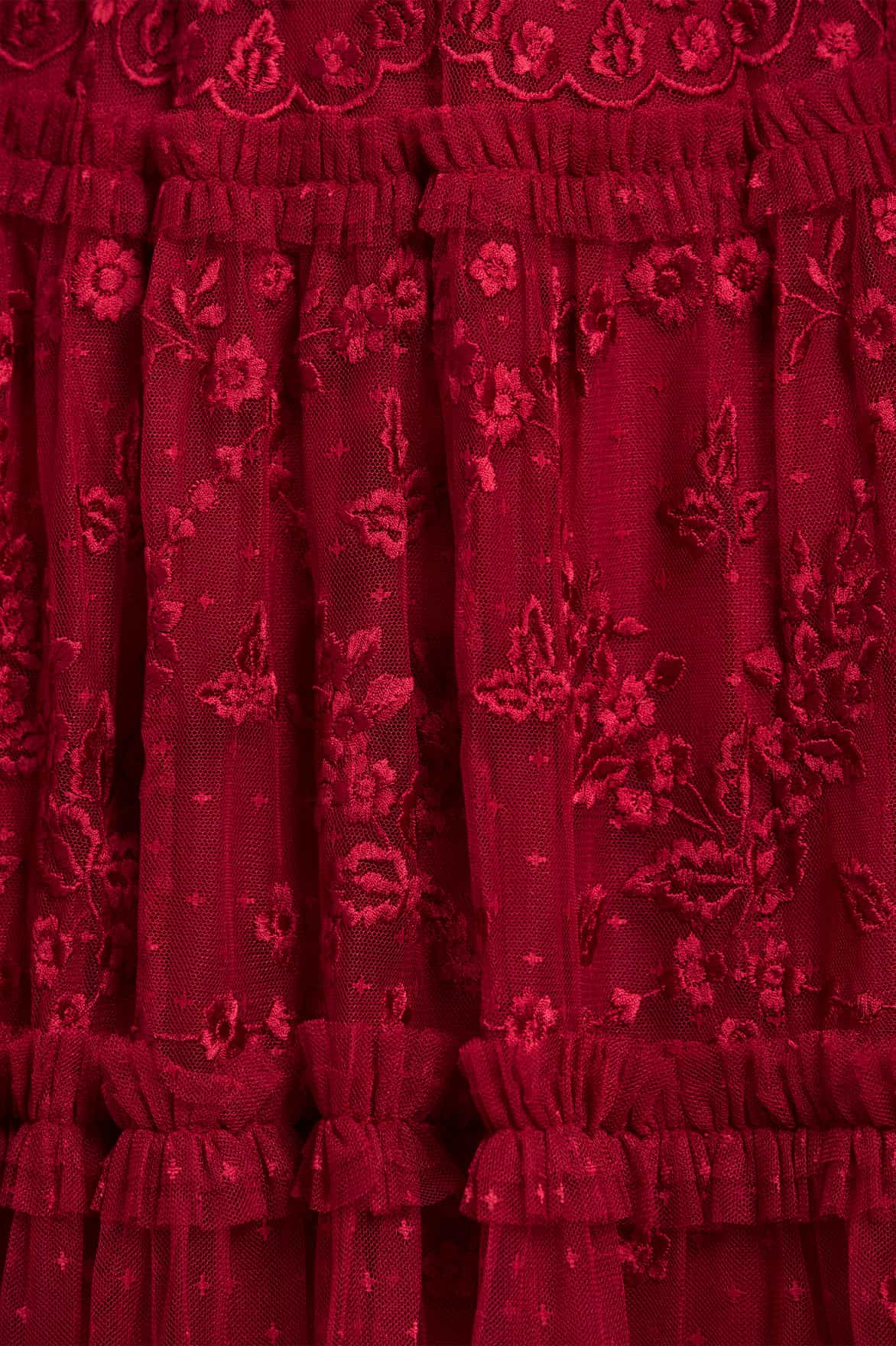 The Autumn Lace Long Sleeve Ankle Gown in Red. This signature Needle & Thread style is designed with floral motif embroidery inspired by antique lace designs. This gown is developed with romantic sheer long sleeves, and a gathered tiered hem, and is created from layers of soft tulle to create a flattering silhouette. A classic and contemporary style.