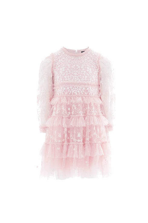 The Blossom Lace Kids Dress in Dusk Pink/Cream. This enchanting dress features intricate embroidery inspired by vintage lace, capturing timeless elegance with a delicate touch. The blouson sleeves with ruffle cuffs add soft volume, while gently gathered skirt tiers adorned with frills create beautiful movement. Finished with signature Needle & Thread frills at the neckline, shoulders, and waist, this piece is full of romantic, heirloom charm.