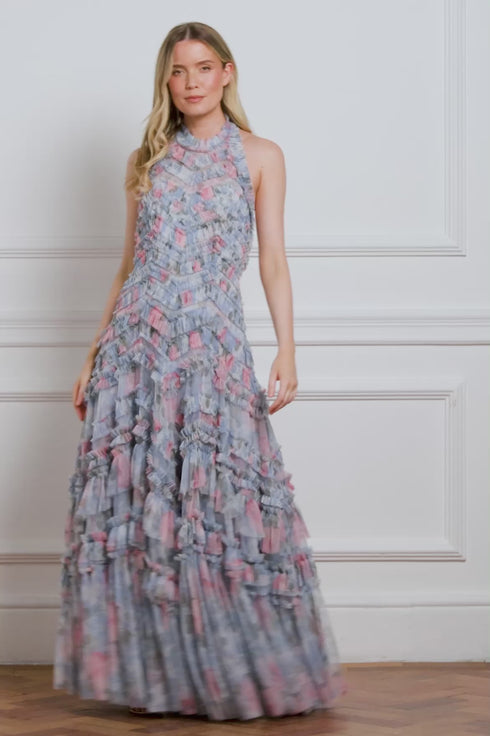 NEW SEASON. The Camille’s Garden Elia Halter-Neck Gown in Skylight. Features a soft, painterly floral print inspired by vintage artwork. Designed with a halter neck and frothy signature Needle & Thread tulle ruffles, this timeless gown moves beautifully for a refined, romantic finish.