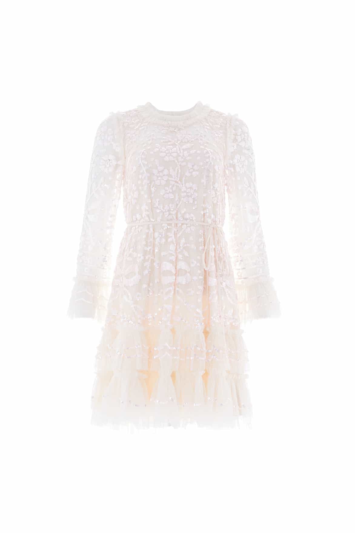 NEEDLE & THREAD EXCLUSIVE. The Celia Long Sleeve Mini Dress in Cream/Dusk Pink. This statement dress is designed with romantic artwork featuring ornate florals and ribbon bows, densely embellished with shimmering sequins for exquisite detailing. Crafted with an effortless loose fit with soft, playful tulle frills on the hem and cuffs. A key piece in our collection.