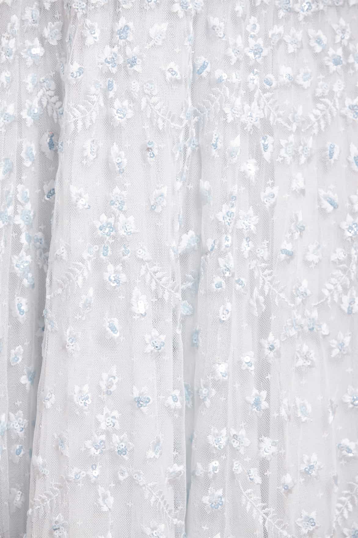 NEW SEASON. The Clover Cape Sleeve Ankle Gown in Ice Blue. A romantic silhouette featuring a softly gathered cape sleeve. Crafted from delicate tulle, the gown drapes beautifully over the shoulders for an ethereal, graceful effect.