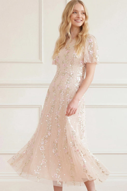 NEW SEASON. The Confetti Round Neck Ankle Gown in Cream/Multi. Beautifully embellished with scattered floral sequins inspired by falling petals, this gown creates a romantic, light-catching finish. The round neckline and flowing ankle-length silhouette offer timeless elegance for occasion dressing.