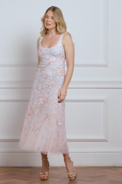 NEW SEASON. The Cressida Embroidery Scoop Neck Ballerina Dress in Seashell/Multi. Beautifully decorated with intricate peony motifs and trailing blooms. Designed with a scoop neckline and soft tulle layers, the embroidery cascades toward the hem, creating an effortlessly elegant silhouette.