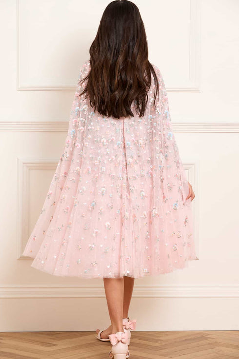 The Dahlia Ditsy Cape Kids Dress in Dusk Pink/Multi. This enchanting dress features shimmering sequin dots and delicate floral embroidery. A soft tulle cape, adorned with floral motifs, adds a whimsical touch. With layers of net and tulle for a twirl-worthy skirt, it’s the perfect fairytale dress for your little one’s special occasions.