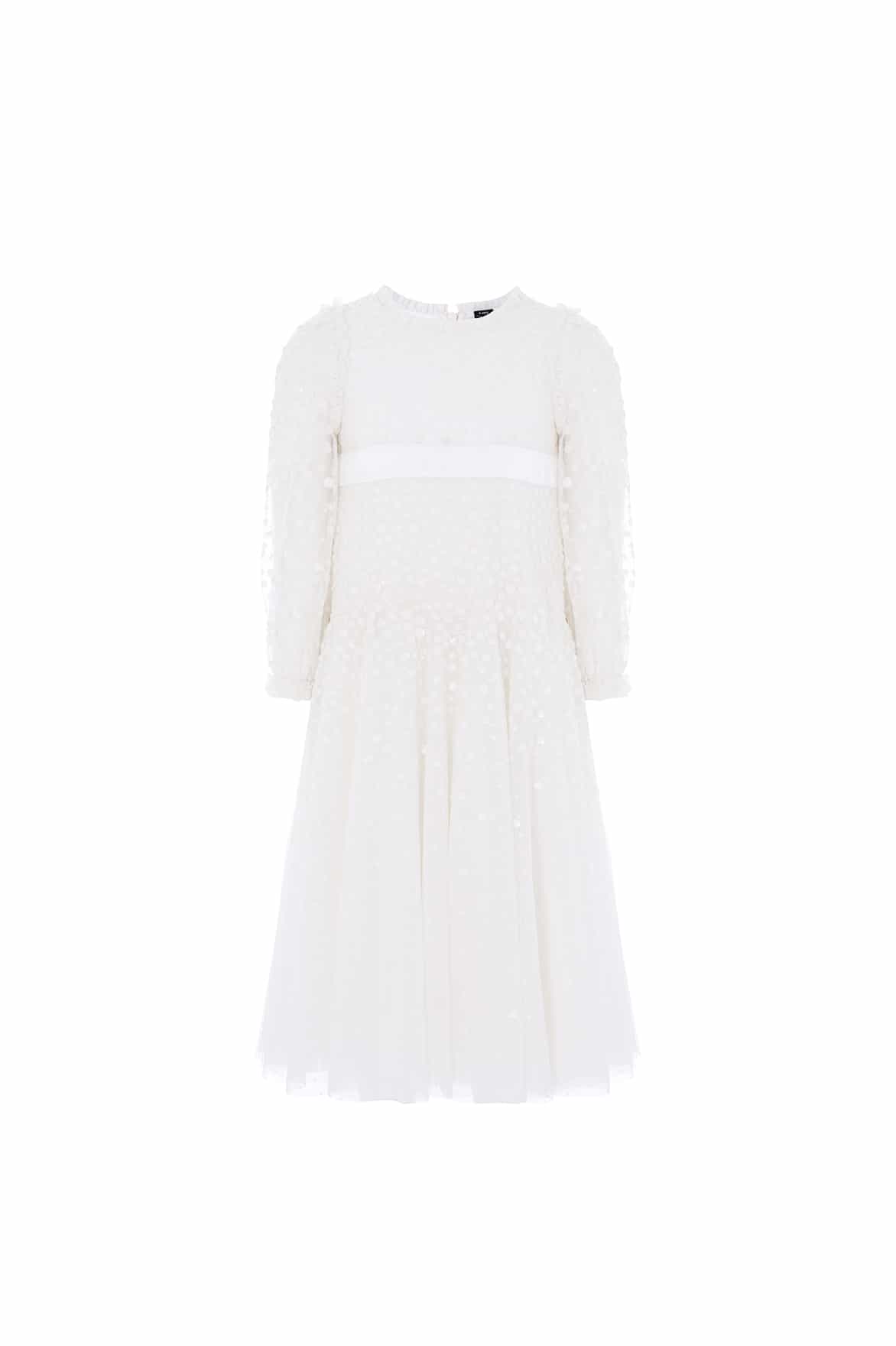 NEW SEASON. The Dappled Sequin Long Sleeve Kids Gown in Swan White. Glimmers with scattered sequins across layers of tulle. Designed with long sleeves and a soft, flowing skirt, this gown adds gentle sparkle to special occasions.