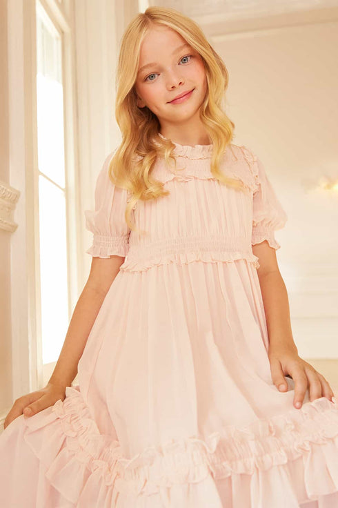 The Emilia Georgette Kids Dress in Opal. A light and flowy silhouette crafted in delicate georgette. With gentle shirring at the waist and sleeves, this piece is perfect for flower girls or any special event. Style with the matching women's Emilia Crepe Dress for a sweet family matching moment.