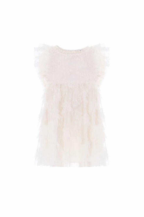 NEW SEASON. The Genevieve Baby Dress in Cream. Captures timeless Needle & Thread charm with tonal floral embroidery on soft tulle. With delicate gathers and flutter sleeves, this dress balances comfort and sophistication beautifully.