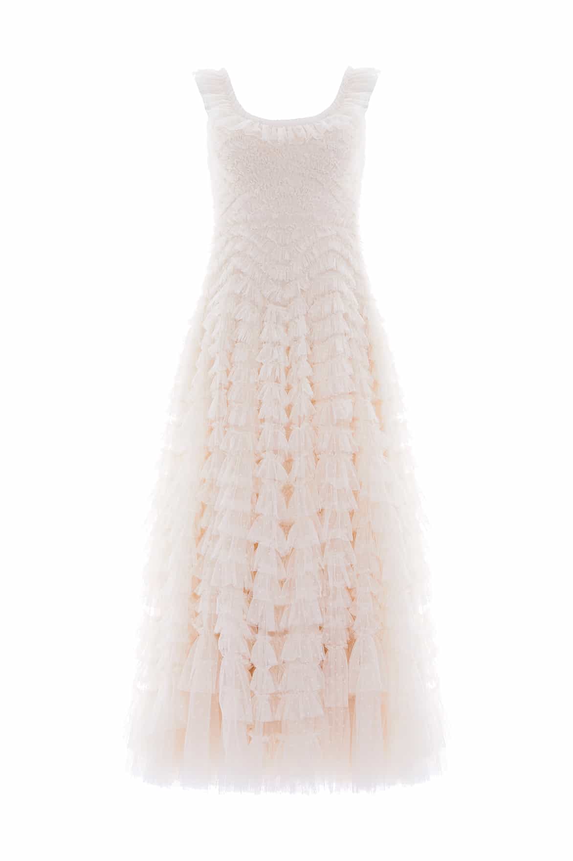 The Hattie Scoop Neck Ankle Gown in Cream. This enchanting gown showcases Needle & Thread’s signature tulle frills, artfully placed in wavy, graduated layers that cascade towards a sweeping hemline. A frill-trimmed scoop neckline adds delicate charm, while the voluminous skirt, crafted from layers of net and tulle, moves with ethereal grace. A timeless piece for the most special occasions.