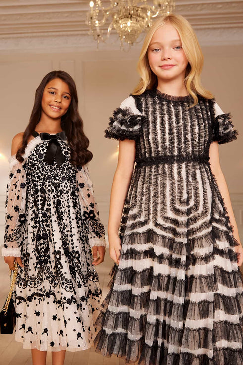 The La Vie En Rose Short Sleeve Kids Dress in Cream/Graphite. This dress is a frothy, romantic style with contrast detailing. Tulle ruffles trim the skirt and bodice in cascading layers, creating a floaty silhouette. Match with Mum with the La Vie En Rose Gown in the same palette for an elegant coordinated look.