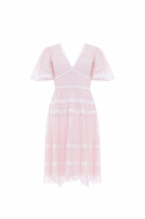 The Lace Primrose Micro Mini Dress in Sky Pink / Moonshine. This dress is beautifully designed with a soft, pastel colourway and subtly contrasting intricate lace trims throughout to create a playful romantic piece. Crafted with a flattering silhouette and engineered with a scallop lace finish. Make an entrance in the Lace Primrose.