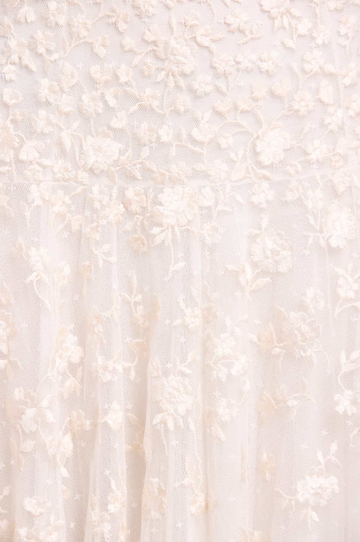 NEW SEASON. The Lea Ditsy Strapless Cape Gown in Swan White/Cream. Adorned with romantic ditsy florals inspired by wild garden blooms, this gown features a strapless cape silhouette with separate scarf. The flowing skirt creates soft movement for a dramatic yet refined occasionwear look.