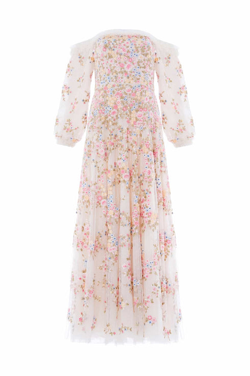 The Lunaria Wreath Off-Shoulder Long Sleeve Ankle Gown in Cream. This beautiful style is embroidered with delicate florals in a scattered garland artwork, inspired by an early 1900s design. Designed with pastel tones to create the perfect painterly artwork. Crafted with an off-the-shoulder neckline for elegant styling and developed with a layered tulle net skirt for a signature Needle & Thread look. Let the Lunaria romance you this season.