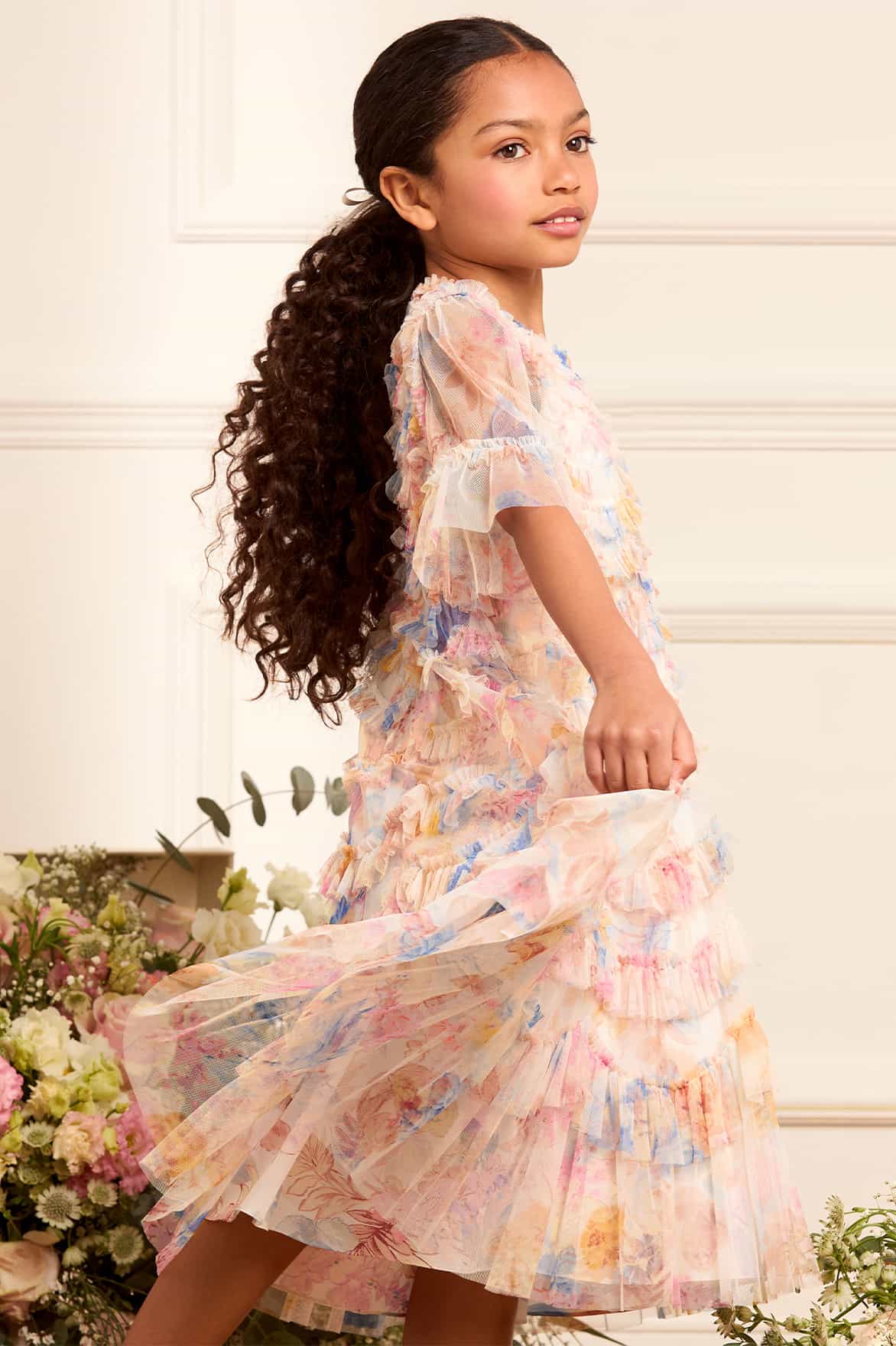 - Floral printed tulle decorated with layers of tulle ruffles.
