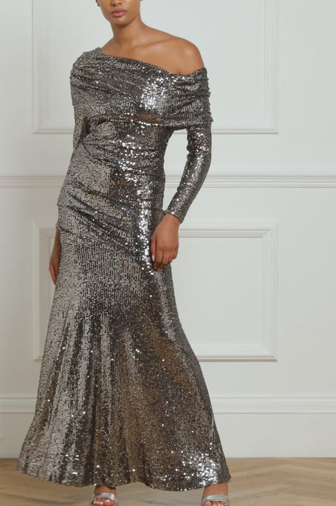 The Nova One-Shoulder Ankle Gown in Gunmetal. This gown is inspired by vintage Hollywood glamour. Beautifully designed with an elegant off-the-shoulder structure. Adorned all over with tiny glittering sequins for the ultimate statement. Crafted with a slim silhouette enhanced by soft drapes across the body, leading to a fluid sweeping skirt. The perfect romantic style for an upcoming special occasion. We hope you adore this new style as much as we do at Needle & Thread head office.