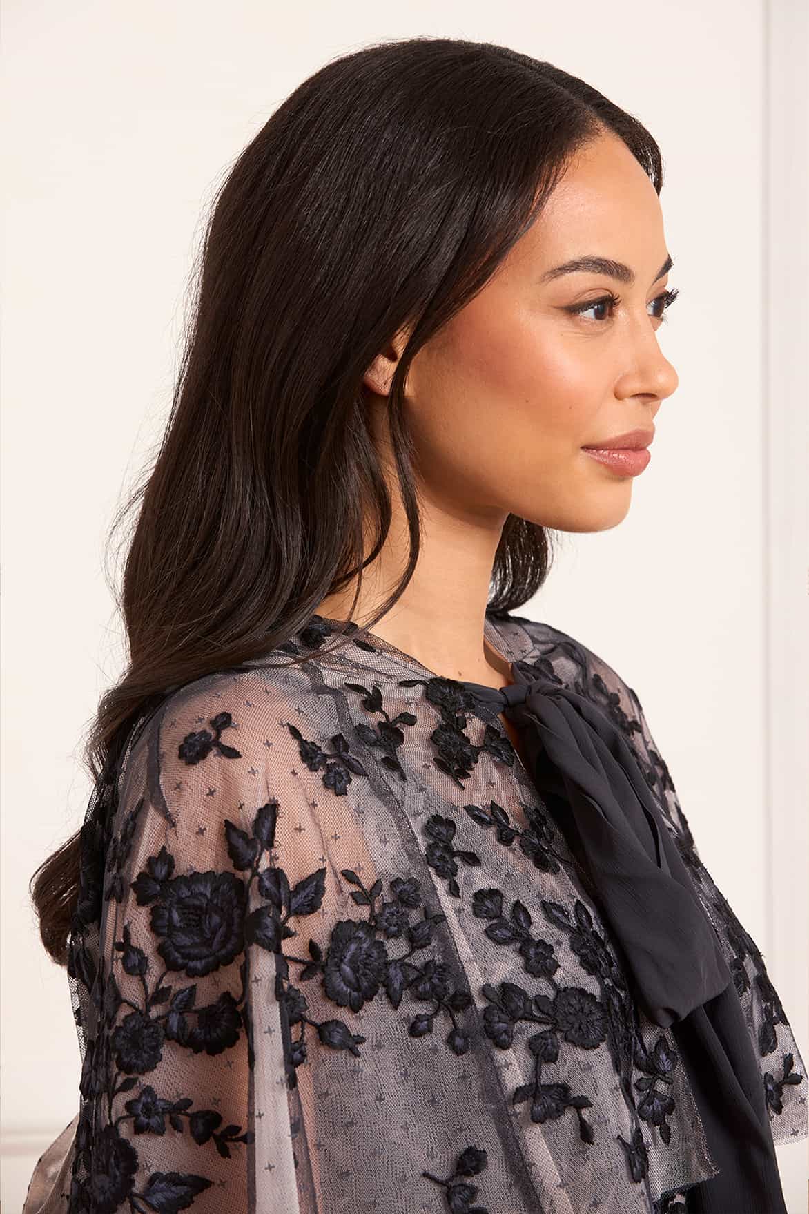 The Rosa Hooded Short Cape in Graphite/Opal. This cropped embroidered cape is designed to complement the matching Rosa Scoop Neck Ankle Gown. Adorned with bold rose and ditsy motifs, the cape fastens with a soft chiffon bow at the neckline. Perfect for making a dramatic and romantic statement.