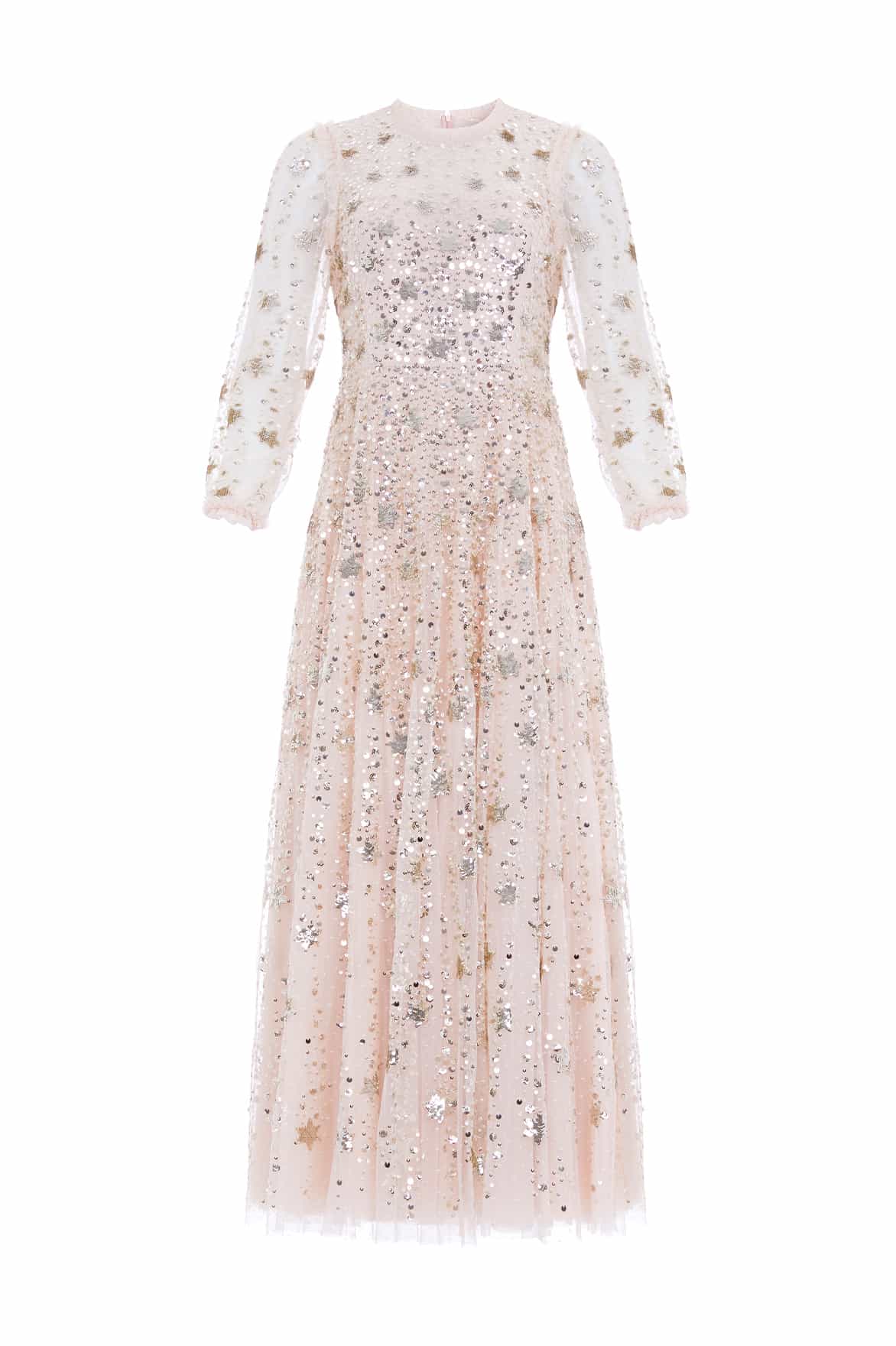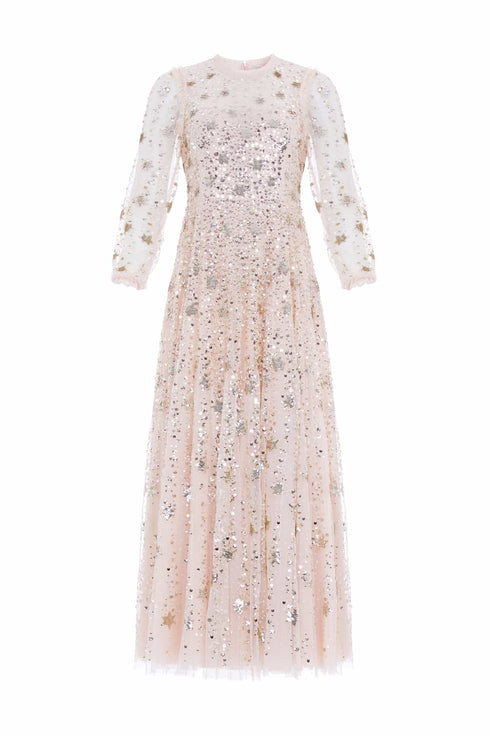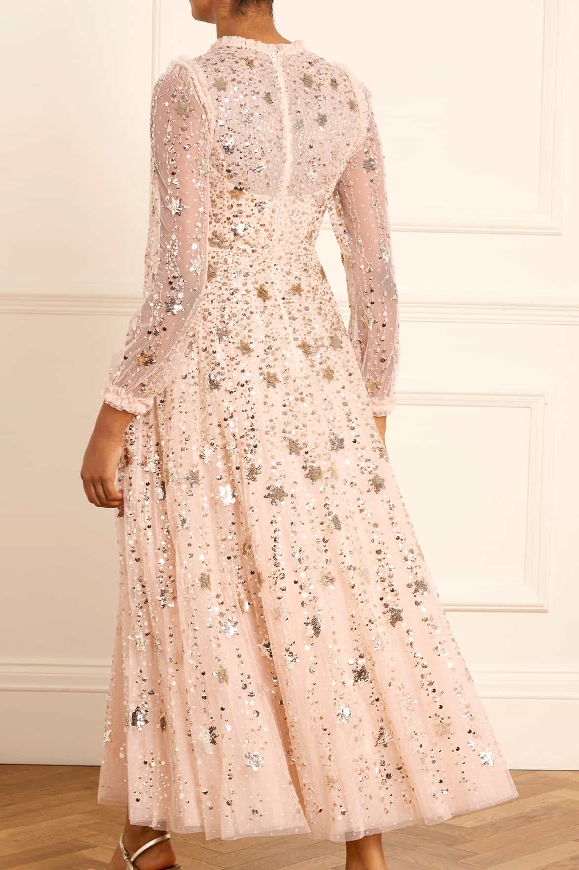 The Shooting Stars Long Sleeve Ankle Gown in Dust Beige/Silver. Beautifully adorned with shimmering embellishments of intricate star motifs, with clusters of tiny sparkling sequins that scatter towards the hem, create a captivating effect. Inspired by the extravagant costumes worn by the Follie’s dancers of the early 1900s, this romantic gown features blouson sleeves adorned with glittering celestial motifs in countless tiny sequins, complemented by signature Needle & Thread tulle frills. The skirt boasts generous layers of net and tulle, culminating in a sweeping hemline. This gown captures the magic of fairytales and the beauty of the night sky.