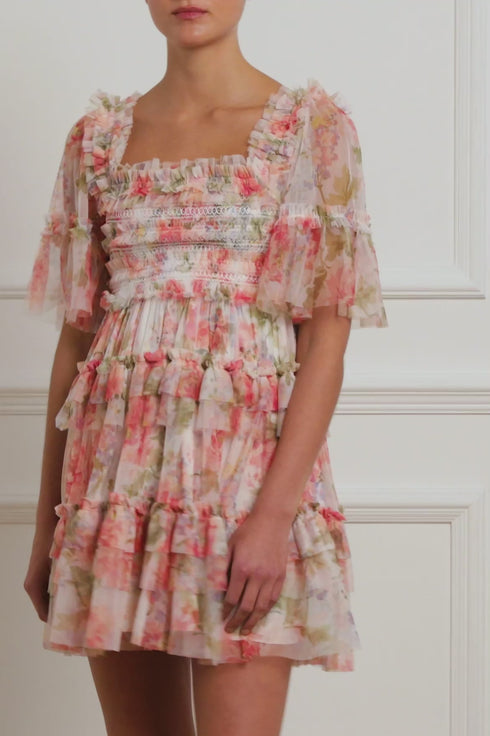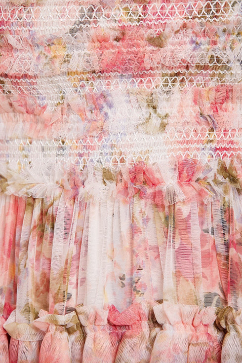 NEW SEASON | NEEDLE & THREAD EXCLUSIVE. The Summer Song Peaches Smocked Micro Mini Dress in Moonshine / Pink. This statement mini dress is beautifully printed with a romantic, floral artwork in sunset colours of dusk. Designed with playful layered tiers and frills, plus a full skirt for romantic movement. This mini features an elasticated smocked waist for comfort and pretty detailing and is beautifully crafted with short sleeves, tulle ruffles and a 'x' kiss motif throughout. The perfect dress to take you from day to night.