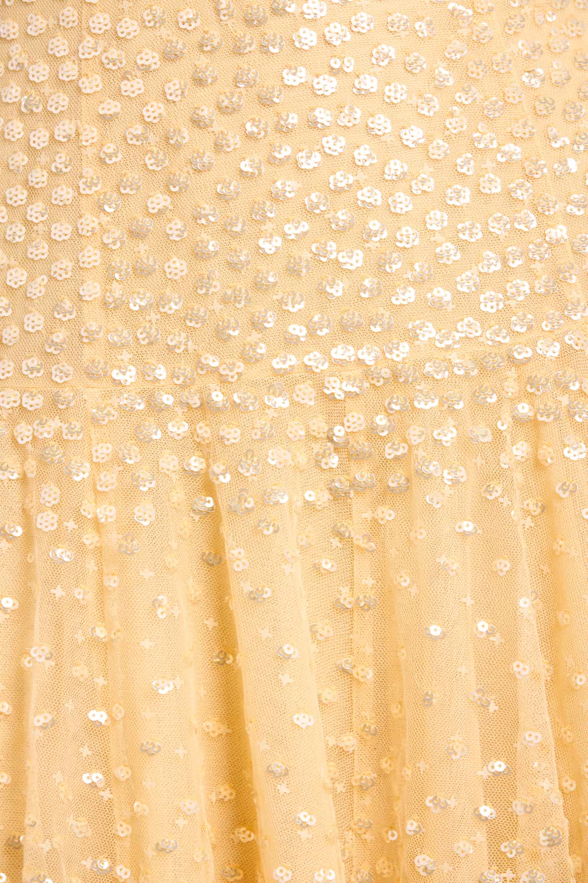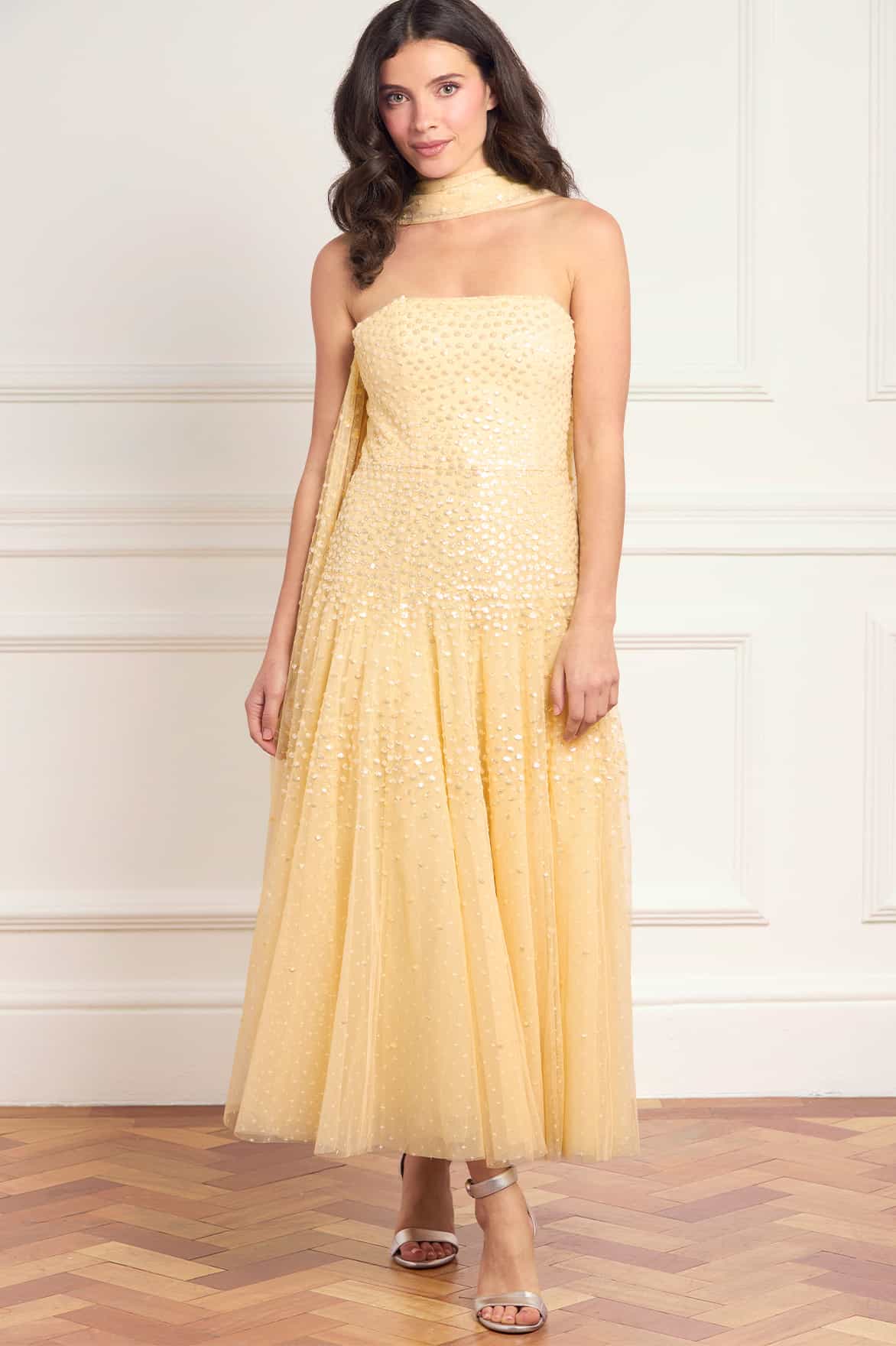 NEW SEASON. The Sunrise Sequin Strapless Cape Ballerina Dress in Citron. This romantic ballerina-length dress features shimmering sequin artwork arranged in soft linear bands. Designed with a strapless silhouette and delicately gathered tulle cape at the back for ethereal, statement styling, perfectly paired with a matching scarf.